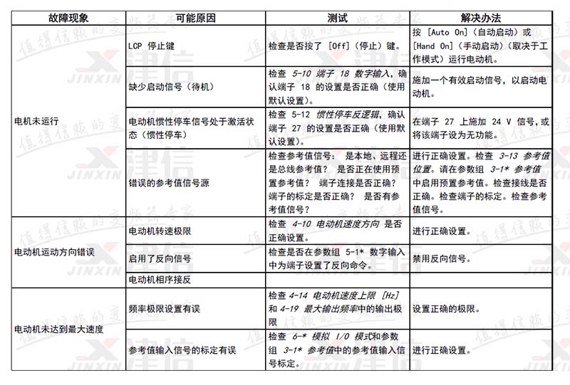 | 31 | V 相缺相 | X | X | 電動(dòng)機(jī) V 相缺失。請(qǐng)檢查該相。 | |