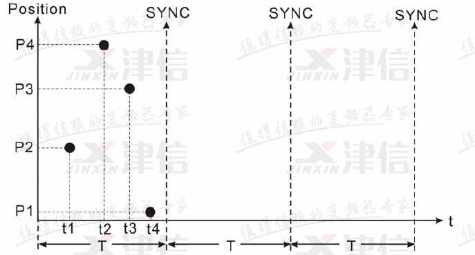 10MC 接有四臺伺服驅動器,T 為同步周期。在同步周期內,四臺伺服驅動器分別在不同的時刻(t1、t2、t3、t4)接受到控制數(shù)據,但是控制數(shù)據并沒有生效。當伺服驅動器接收到同步信號(SYNC),控制數(shù)據同時生效。