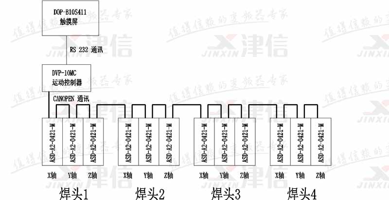目前市場上以單焊頭超音波焊接機為主,但是單焊頭存在占用場地,效率低等缺點,所以上海津信為客戶推出了以臺達10MC11T和ASD-A2-0421-M型伺服驅動器為主開發(fā)的4焊頭超音波焊接機。