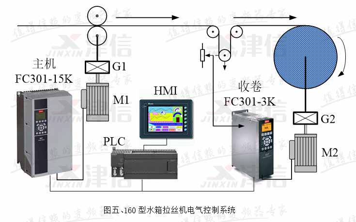 水箱拉絲機是子午線輪胎用鋼簾線生產(chǎn)企業(yè)的關(guān)鍵設(shè)備,其收卷控制是變頻器跳舞輪位置反饋控制。由于生產(chǎn)速度快,用量大,加上環(huán)境比較惡劣,因此要求采用性能優(yōu)異,穩(wěn)定性好,質(zhì)量可靠和抗腐蝕能力強的變頻器。我廠為拉拔0.22毫米以下線徑的鋼簾線定制了160型新型水箱拉絲機上,全部選用了丹佛斯最新推出的FC系列變頻器作收卷和主傳動驅(qū)動,取得了很好的運行效果。
