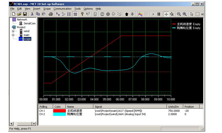 卷繞控制的特點:同樣的一套PID調(diào)節(jié)參數(shù),勻速時易于穩(wěn)定,波動也較小;而加速時就不易于穩(wěn)定,而且因為跳舞輪位置有靜差,波動幅度也較大。因此PID調(diào)節(jié)參數(shù)主要針對加減速過程予以優(yōu)化。MCT軟件有數(shù)字示波器功能,通過實時觀測線速度和跳舞輪位置在加減速時的變化曲線,能很方便地調(diào)整調(diào)節(jié)參數(shù)。