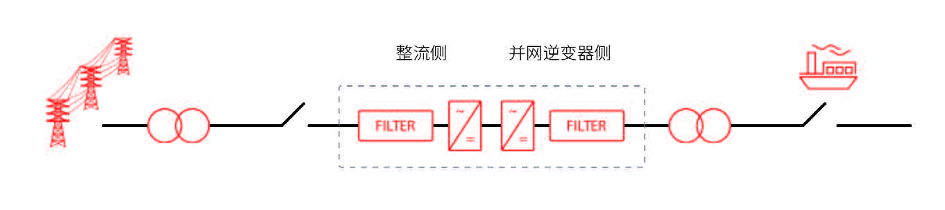 丹佛斯岸電電源系統(tǒng)通常包含岸側整流裝置和船側并網變流器裝置,如下圖所示: