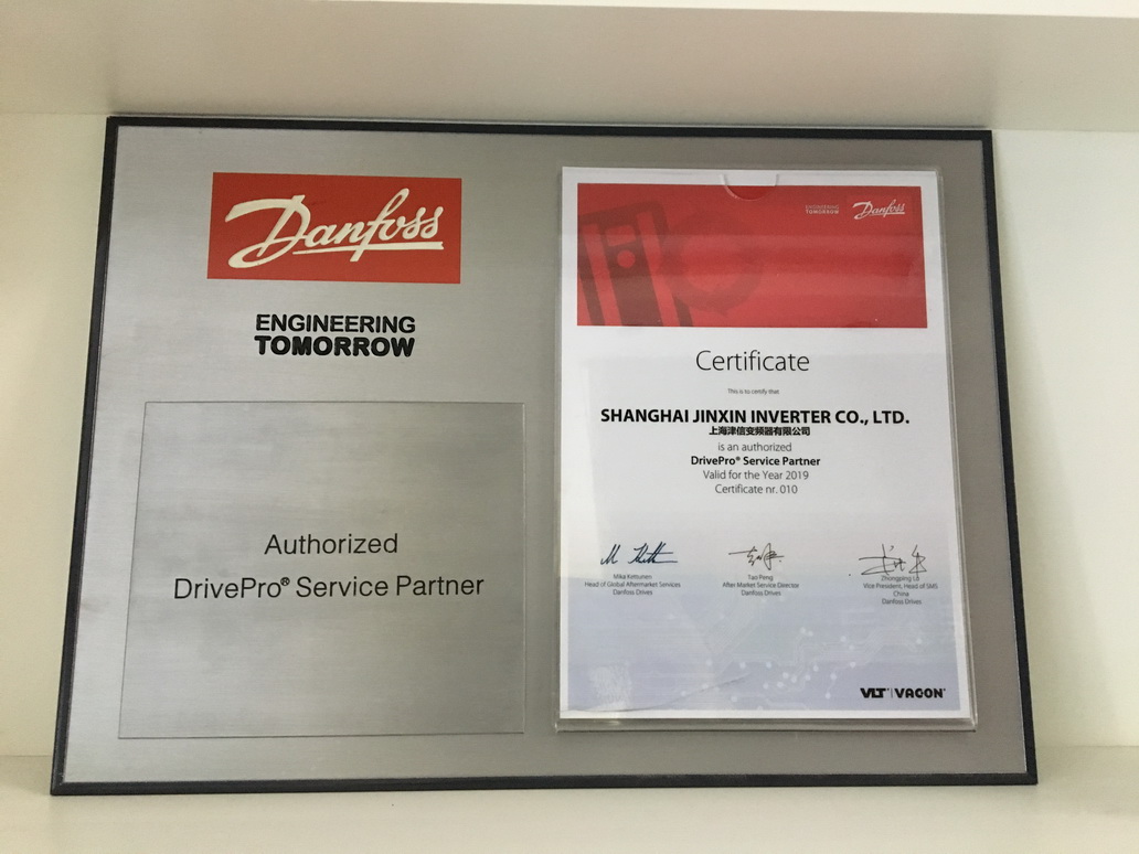 2018年12月11日, 丹佛斯中國(guó)區(qū)服務(wù)總監(jiān)彭濤先生和服務(wù)經(jīng)理毛申麟先生向上海津信變頻器有限公司頒發(fā)了丹佛斯授權(quán)“DrivePro®”服務(wù)商的授權(quán)證書(shū)。上海津信成為全球第十家,中國(guó)華東和華南地區(qū)丹佛斯授權(quán)“DrivePro®”服務(wù)商。